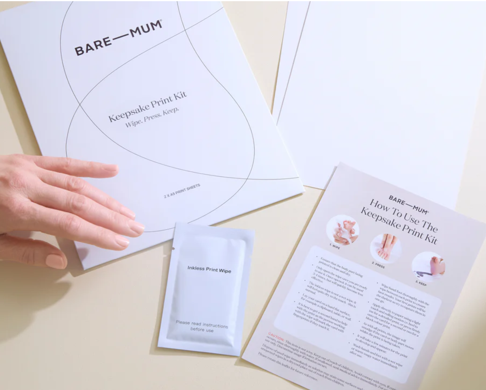 Þetta vottuða, eiturefnalausa prentsett frá BARE-MUM notar sérstakt þurrkuefni og pappír til að mynda nákvæm og endingargóð handa- eða fótaför – án bleks.