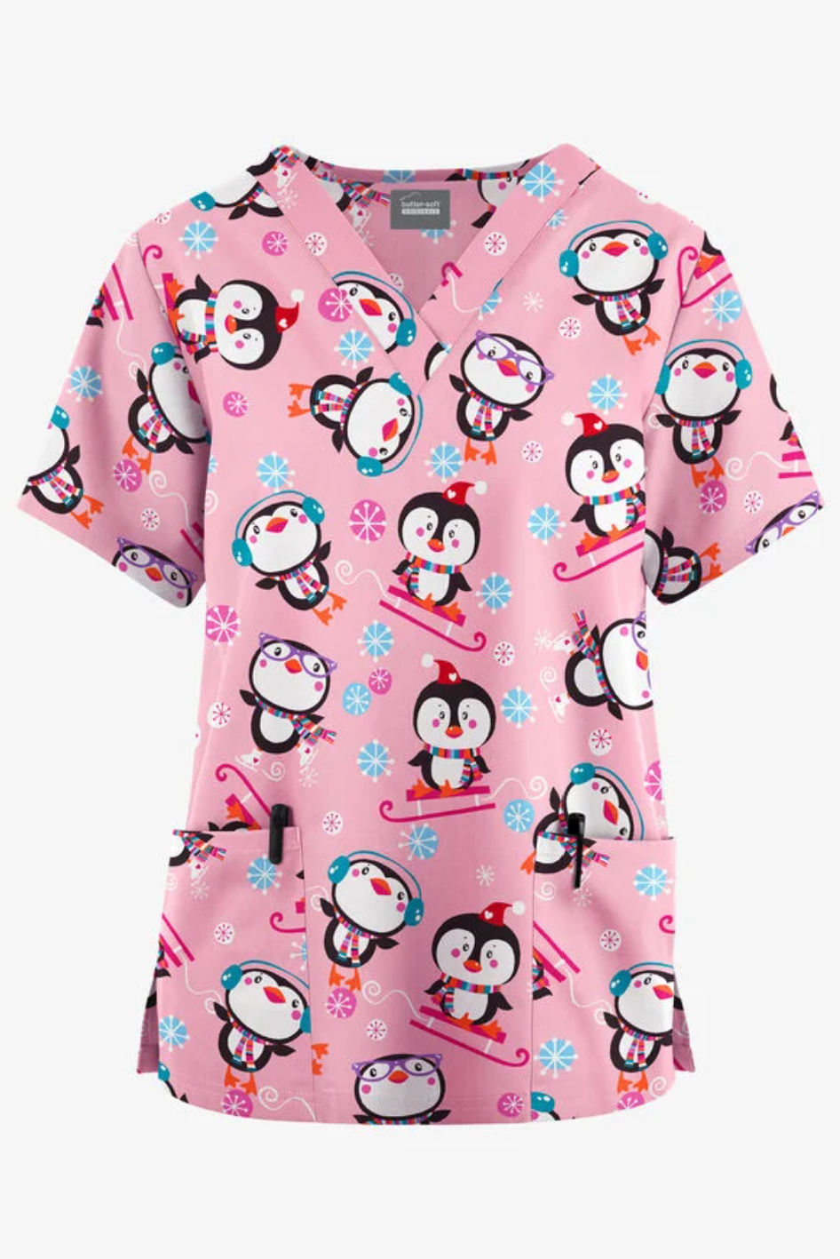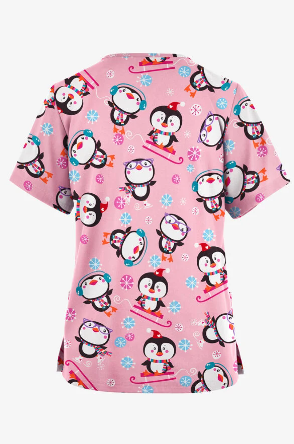 Þægilegur vinnubolur í klassísku, örlítið rúmmuðu sniði með V-hálsmáli. Hannaður með tveimur praktískum framvösum og hliðaropum fyrir góðan hreyfanleika. Bolurinn er skreyttur hátíðlegu mynstri af mörgæsum á sleðum á bleikum, snjókornaprýddum bakgrunni.