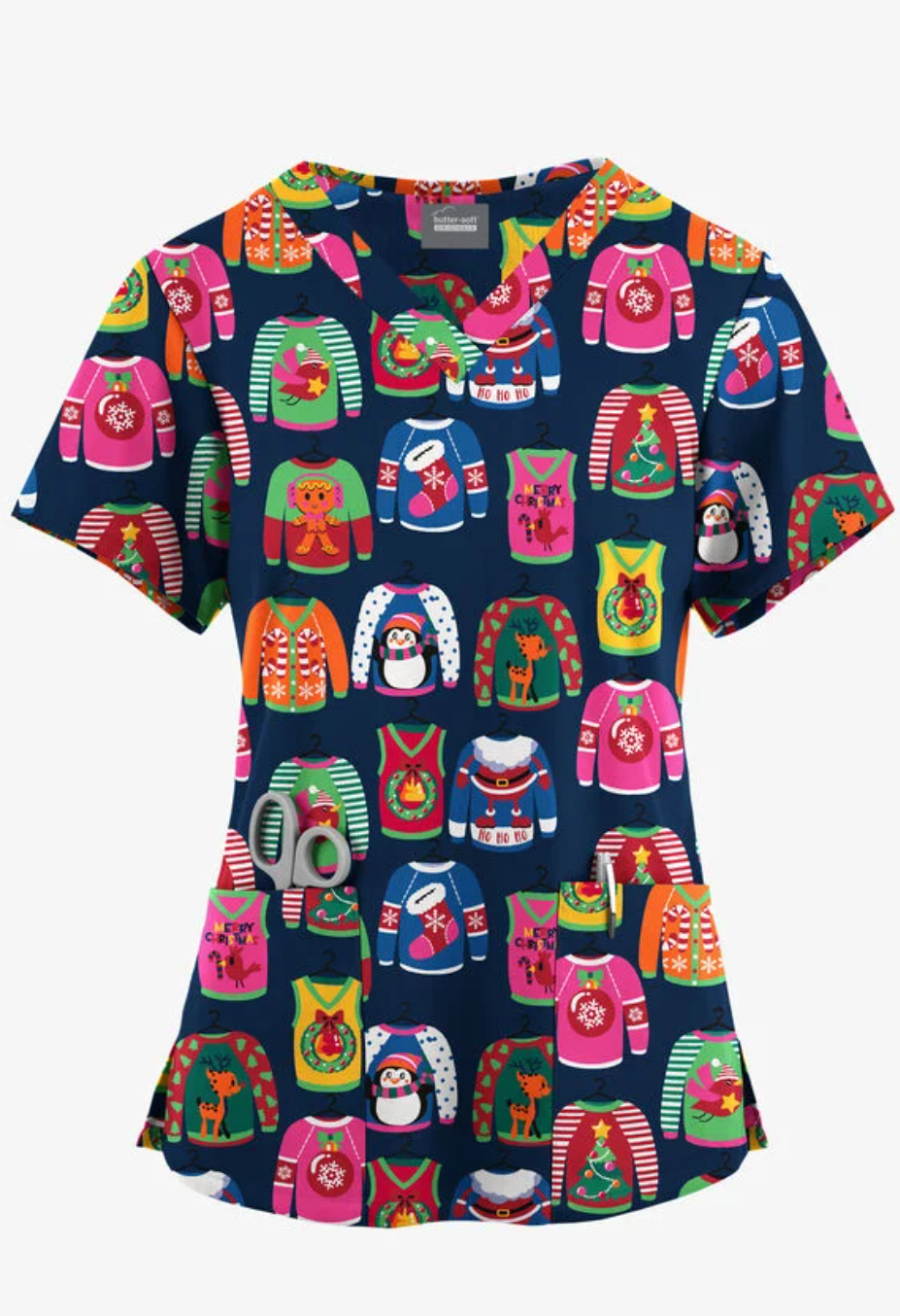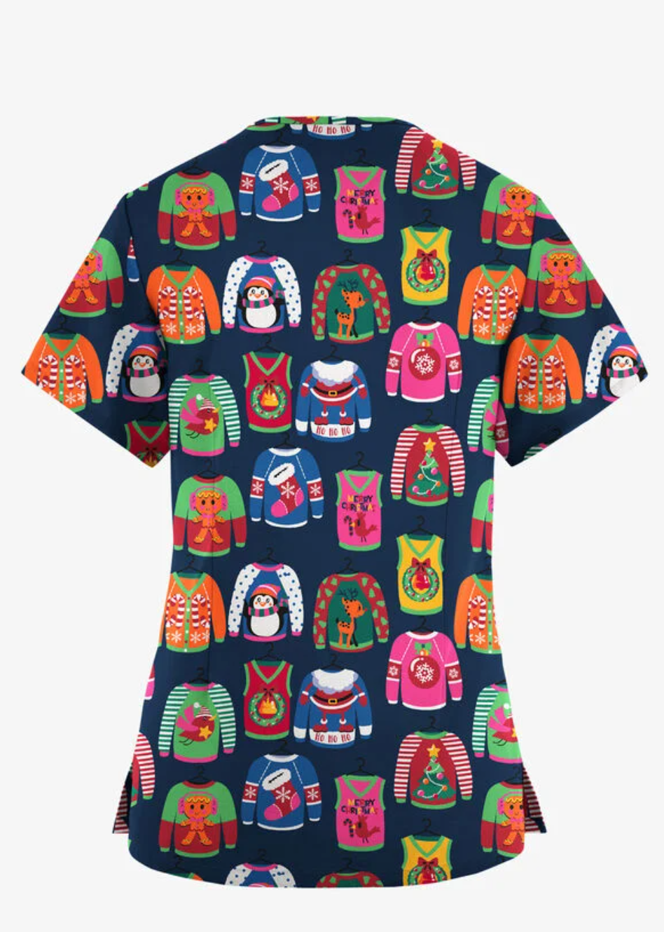 Klæðilegt snið með bogadregnu V-hálsmáli, bakið er dregið inn og hliðarop gefa gott rými fyrir hreyfingu. Mynstrið eru jólapeysur á dökkbláum bakgrunni.