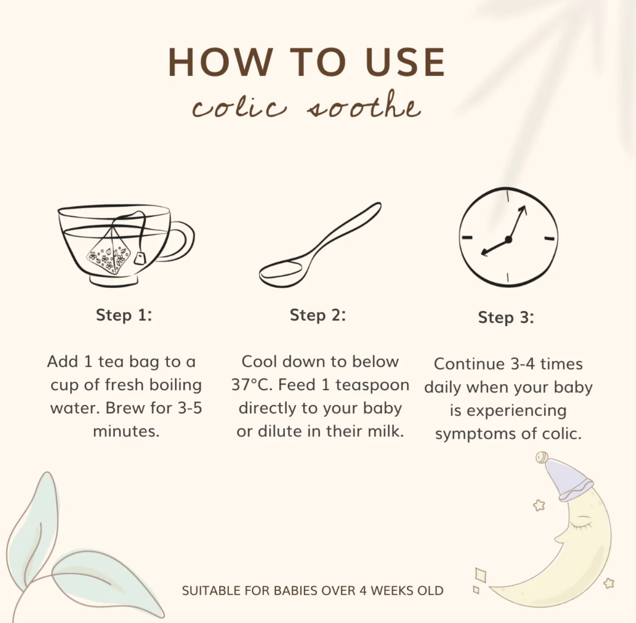 Þetta róandi te er sérvalið af ljósmæðrum og inniheldur þekkta blöndu sem dregur úr einkennum magaóþæginda hjá ungabörnum. Blandan er hönnuð til þess að minnka einkenni loftgangs, meltingatruflana, hægðatregðu og krömpum í meltingavegi. Teið má gefa frá 3 vikna aldri og hentar öllum í fjölskyldunni til að slaka á meltingaónotum.